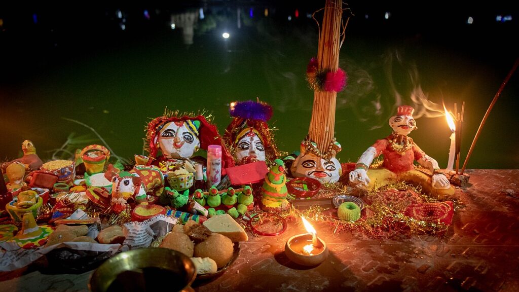 The festival lasts for four days. During this time, devotees fast, take holy baths in rivers or ponds, and pray to the Sun God at sunrise and sunset. One of the most beautiful parts of Chhath Puja is when people stand waist-deep in water and offer fruits, flowers, and prayers to the setting and rising sun.