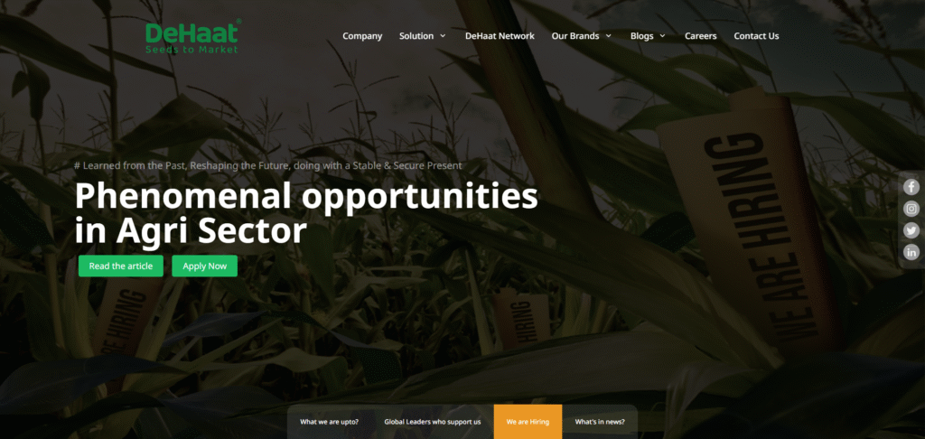 DeHaat is a technology-driven platform offering end-to-end agricultural services to farmers, including seeds, fertilizers, advisory, and market linkages.