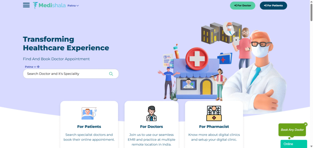 Medishala is a digital health platform offering telemedicine services, appointment bookings, and online healthcare consultations in small towns and rural Bihar.