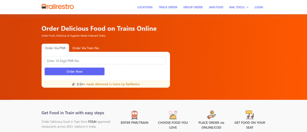 RailRestro is a train food delivery app that lets passengers order meals online and get them delivered directly to their seats.
